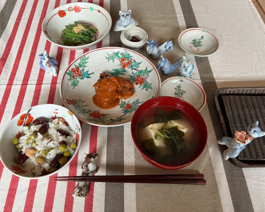 紅梅の碗にこれでもかの豆豆御飯。お椀の縁の金継ぎが気に入ってます。