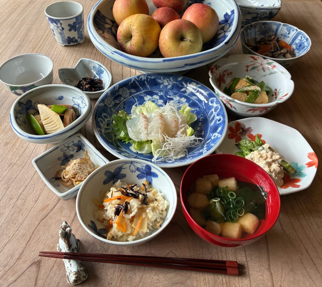 朱塗りの汁椀の上右側は色絵の桜模様六角皿にアスパラ。ザーサイ入りのアイルランドソースかけ。